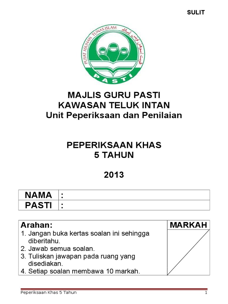 Koleksi ini boleh diakses secara dalam talian atau dimuat turun ke dalam peranti. MAJLIS GURU PASTI KAWASAN TELUK INTAN Unit Peperiksaan dan Penilaian PEPERIKSAAN KHAS 5 TAHUN 2013 NAMA. LESSON NEW SUPER DRAFT.